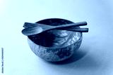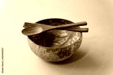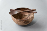 recycling, tableware and eco friendly concept - close up of coconut bowl with brown wooden spoon and fork on table