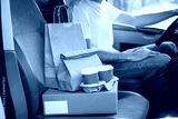 Blank box, coffee cups, paper packages and courier in car. Delivery