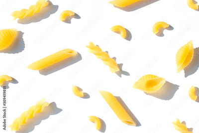 Different types of Italian pasta concept flat lay on the white background. Top view seamless food pattern.