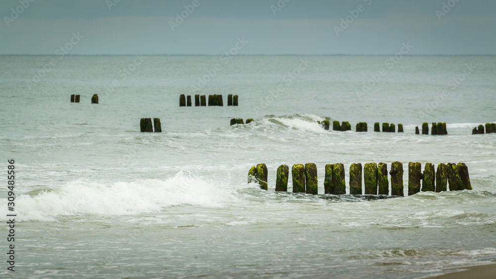 Wooden piles overgrown with algae, stuck in the shoreline of the sea, protection against waves.