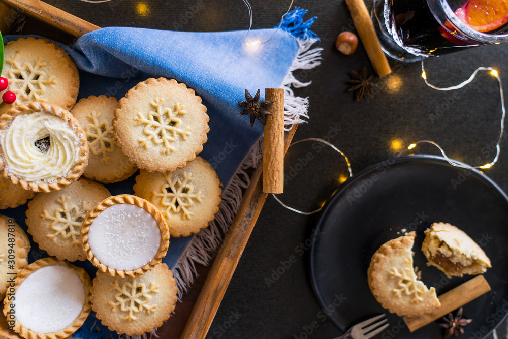 Top view warm cosy composition of traditional english festive pastry mince pies in wooden tray, spices, black plate with broken pie and lights garland on black background. Close up. Selective focus.