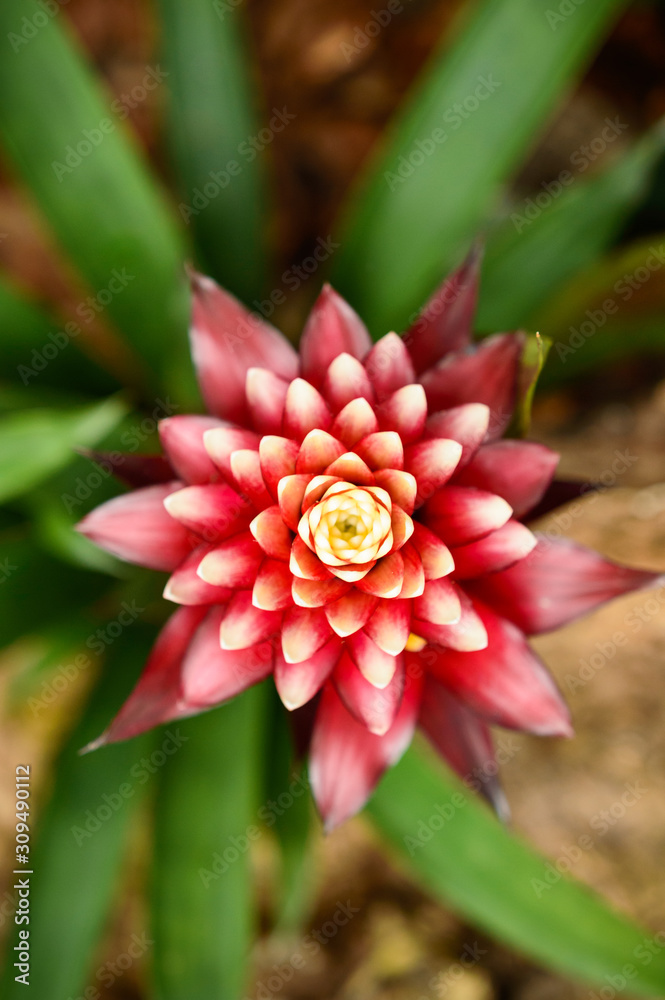 Blooming bromelia, a beautiful red flower with white tips on the petals of the flower.