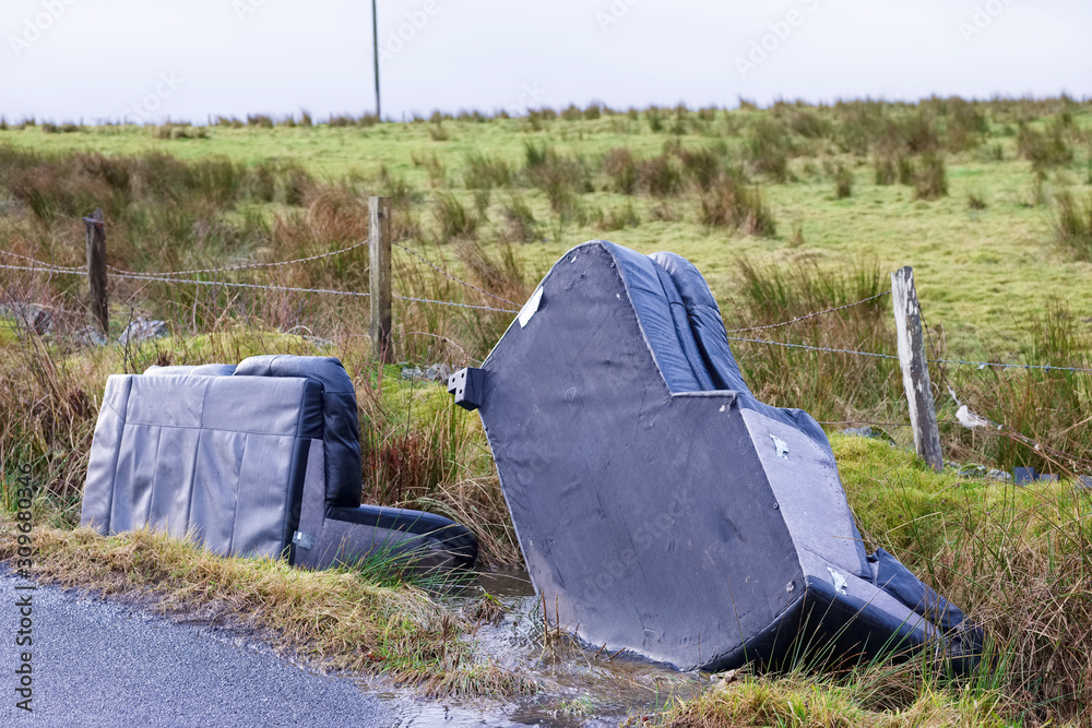 Fly tipping of furniture sofa chairs at roadside in rural area causing countryside pollution