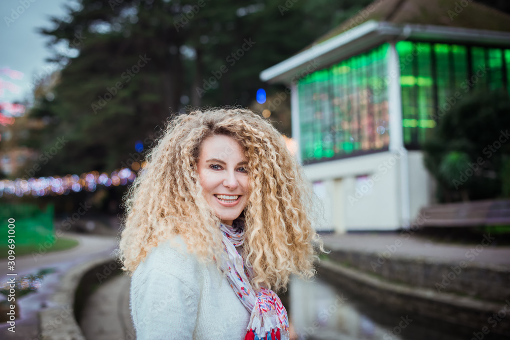 Close up portrait of happy smiling curly blonde woman in a white knitted pullover with bright scarf looking at camera on lightened park background. Autumn, winter walking time. Outdoor. Copy space.