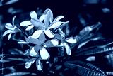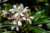 Collection of white plumeria blooms with green foliage on a plant in Honolulu, Hawaii