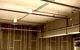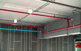 Automatic fire sprinkler safety system and red water supply pipe. Fire Suppression. Fire protection and detector. Fire sprinkler system with red pipe hanging from ceiling inside building. Wiring tube.