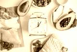 Intermittent fasting and Healthy food. Concept.Alarm clock and Keto diet food ingredients on white table.Ketogenic mean Low carb and High fat.