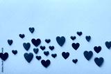 Valentine day greeting card or banner. Red hearts on blue background top view. Flat lay style.