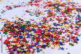 red bright holidays decoration confetti, postcard templated with space for text