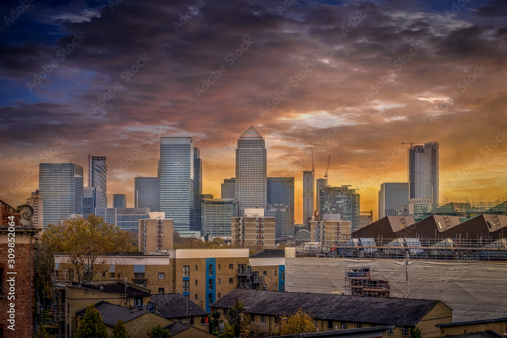 View of the London bank district on Canary Wharf with docks and dramatic sunset sky