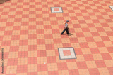 Asian person walking along patio tiles outdoor sing Singapore directly above view