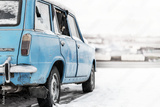 old abandoned car station wagon blue in color with broken Windows. parked on the side of a winter road in the snow in Russia. copy space
