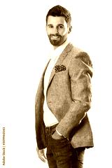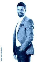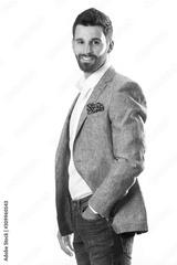 A young man wearing a Blazer in blue jeans on a white background