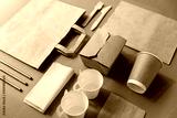 package, recycling and eating concept - disposable paper container for takeaway food with cups, bags, napkins and cutlery on table