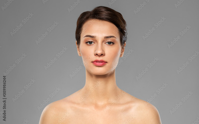 beauty, bodycare and people concept - beautiful young woman with bare shoulder over grey background