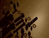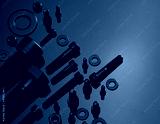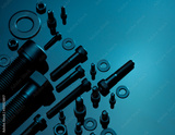 Metal Bolts, nuts, and washers. Fasteners equipment. Hardware tools. Stud bolt, flat washers, hex nuts, and hex head bolts in workshop. Threaded fastener use in automotive engineering. Hexagonal bolt.