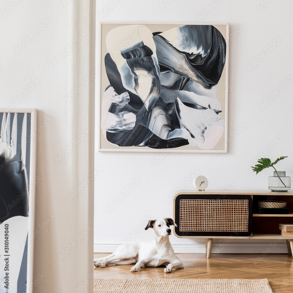 Design scandi home interior of living room with wooden commode, black rattan pouf, plant and elegant accessories. Stylish home decor. Mock up abstract paintings. Dog is lying on the floor. Template.