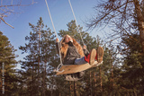 Smiling girl with tresses hair in grey coat flying on a swing against blue sky