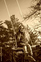 Smiling girl with tresses hair in grey coat flying on a swing against blue sky
