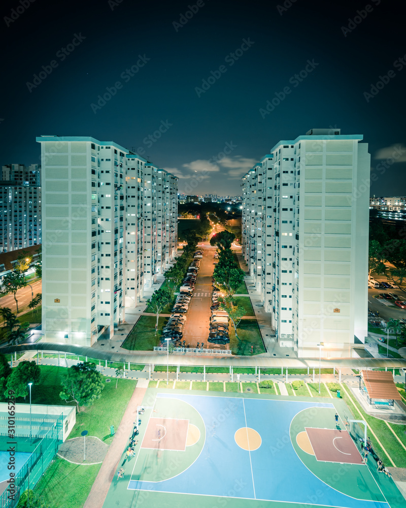 Top view Eunos neighborhood HDB complex in Singapore at evening
