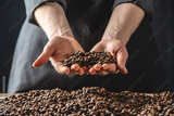 Hands holding fragrant coffee beans. A pile of roasted Arabica grains. Selection of fresh coffee for espresso