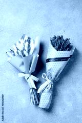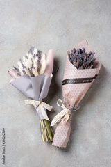 Two bouquets of lavender and lagurus in the package on a light concrete background.