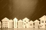 Miniature wooden houses on a red background. Real estate concept. City. Agglomeration and urbanization. Market Analytics. Demand for housing. Rising and falling home prices. Population. Copy space