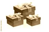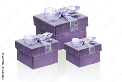 Three lilac gift boxes isolate on a white background, close-up, reflection