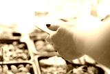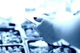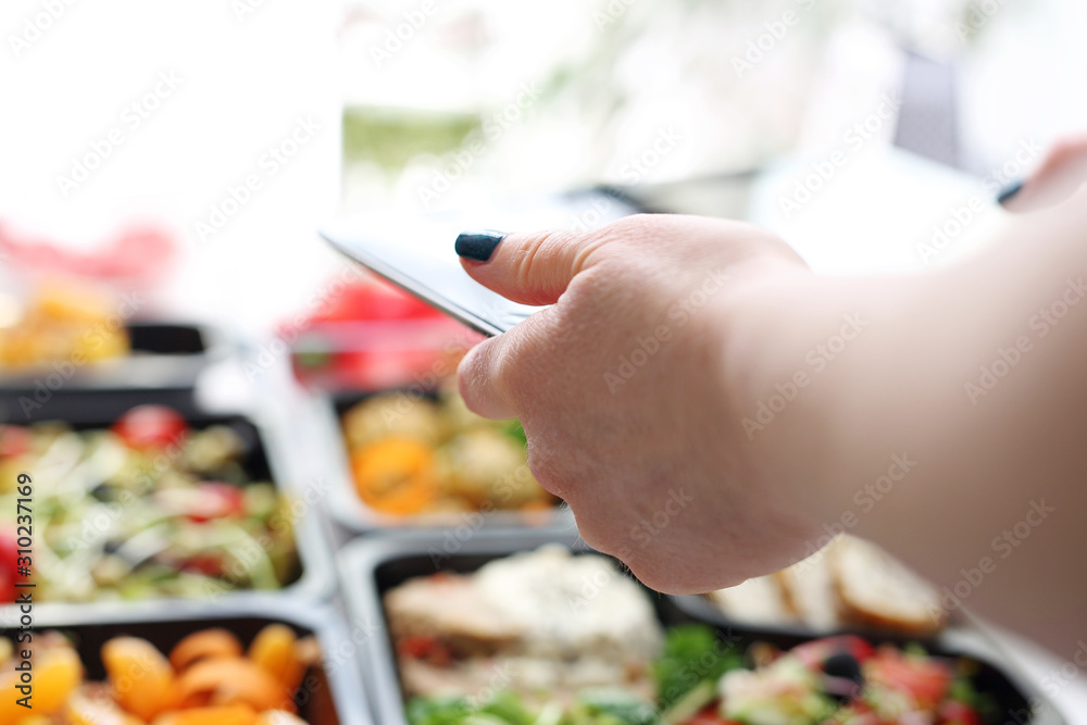 Dietary catering, balanced box diet. Ready lunch boxes in the kitchen. The woman photographs the products