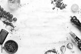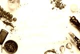 Food banner. Spices, vegetables and herbs on a white wooden background. Top view. free space for your text. Rustic style.