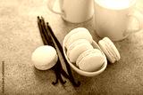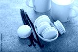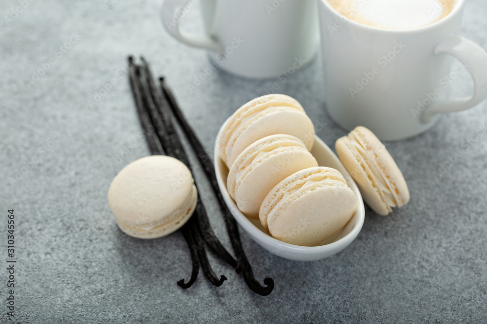 Vanilla macarons in a little bowl with vanilla pods, french dessert