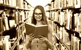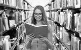 high school, education and knowledge concept - smiling teenage student girl in glasses reading book over grey background