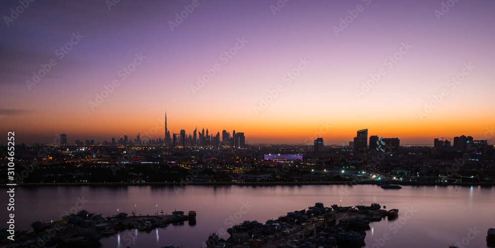 Dubai susnet over the creek in the background the silhouette of the tall buildings