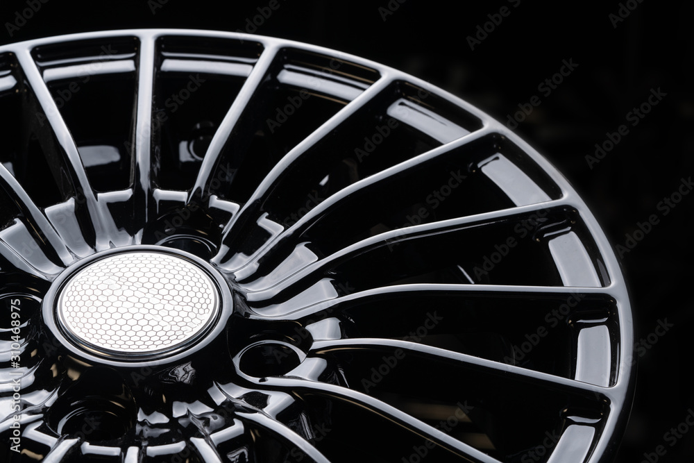 cast aluminum disc alloy wheel modern, close-up on black background, spokes and rim