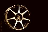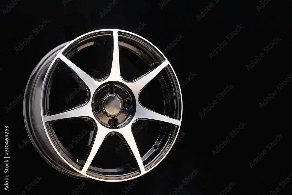 Shiny cast disc with thin sports spokes and polished aluminum surface on a dark background close-up. empty space for text
