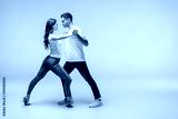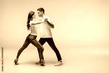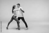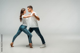 side view of dancers in t-shirts and jeans dancing bachata on grey background