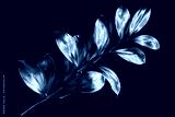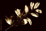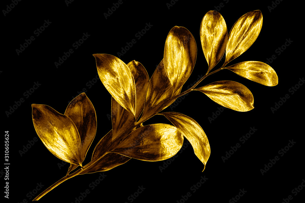 One golden leaves branch on black background isolated closeup, decorative gold color plant sprig, yellow shiny metallic twig, foliage illustration, floral design element, herbal symbol, botanical sign