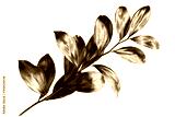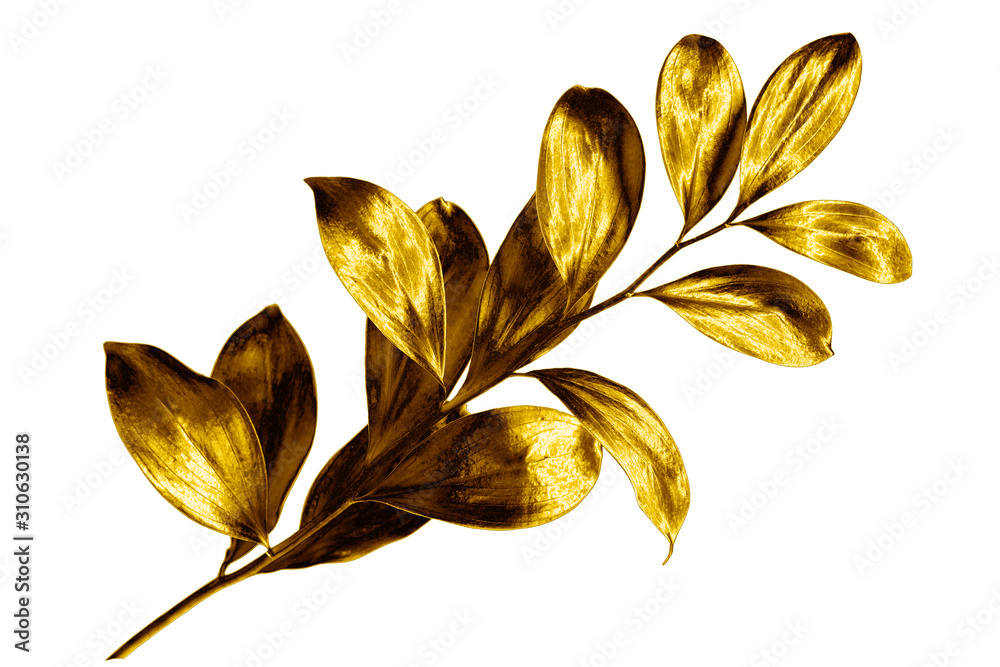 Tree branch with golden leaves on white background isolated closeup, decorative gold color plant sprig, yellow shiny metal twig, foliage illustration, floral design element, herbal symbol, botany sign