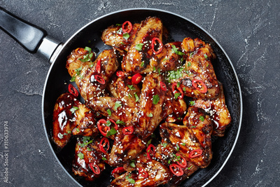 overhead view of spicy fried chicken wings