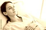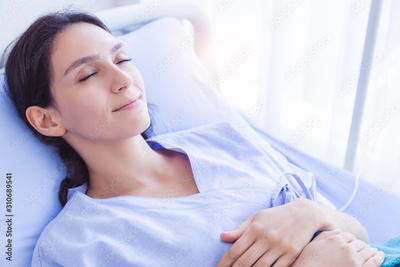 Patient woman feel safe, happy with smile face when sick lady sleep in hospital room. She recuperate for while. Patient female getting better, getting well and nearly go back home. She get sweet dream