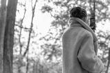 Attractive beautiful brunette girl in white coat walking among the colorful forest and making photo on her mobile phone
