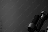 Metal bolts on blue background. Hardware tools. Closeup hex head bolt and socket cap bolt with copy space. Threaded fastener use in automotive engineering. Hexagonal bolt. High strength fasten bolt.