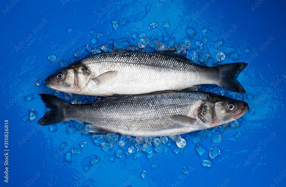 Seabass fish on ice on blue color background, top view
