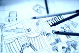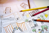 Video Pre-production for film movie storyboard concept : Color pencil drawing story board animation comic carton, design creative scene layout at studio. Behind process work before production films