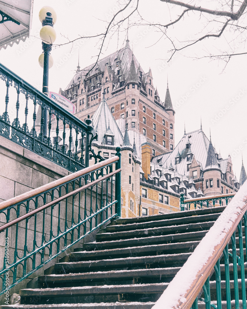 Cityscape of old Town of Quebec, Canada, in winter time. Can see the Chateau Frontenac with snow