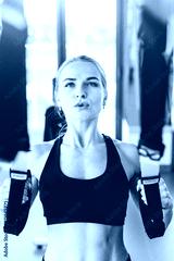 Women training with fitness straps in the gym. Beautiful lady exercising her muscles sling or suspension straps.