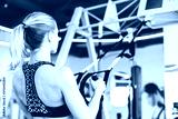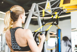 Women training with fitness straps in the gym. Beautiful lady exercising her muscles sling or suspension straps.