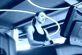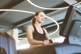 The athletic woman dressed in a black sportswear running on the treadmill in the modern gym