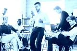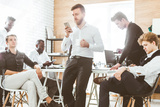 A team of young businessmen working and communicating together in an office. Corporate businessteam and manager in a meeting.