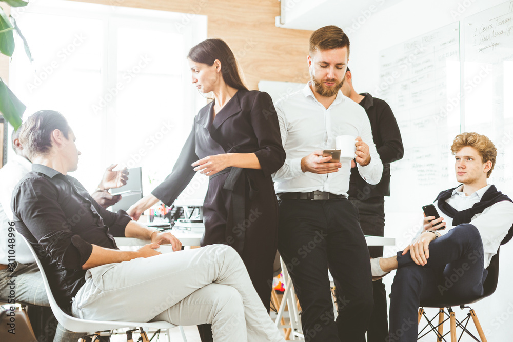 A team of young businessmen working and communicating together in an office. Corporate businessteam and manager in a meeting.